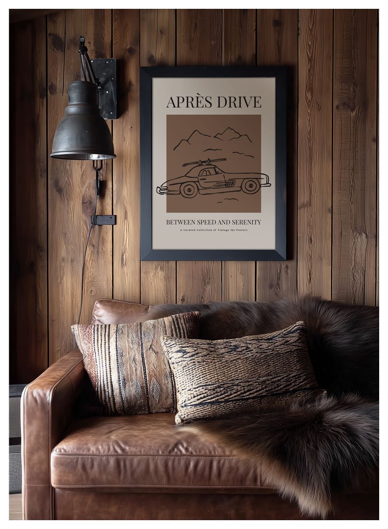 Stilingas retro stiliaus plakatas su eskizinių linijų iliustracija. Subtili spalvų paletė ir lengvos, laisvos linijos kuria rafinuotą nuotaiką, įkvėptą après-ski gyvenimo būdo. Plakatas erdvėms, kur susitinka klasikinis automobilio dizainas, greitis ir aistra kalnams bei slidinėjimui.