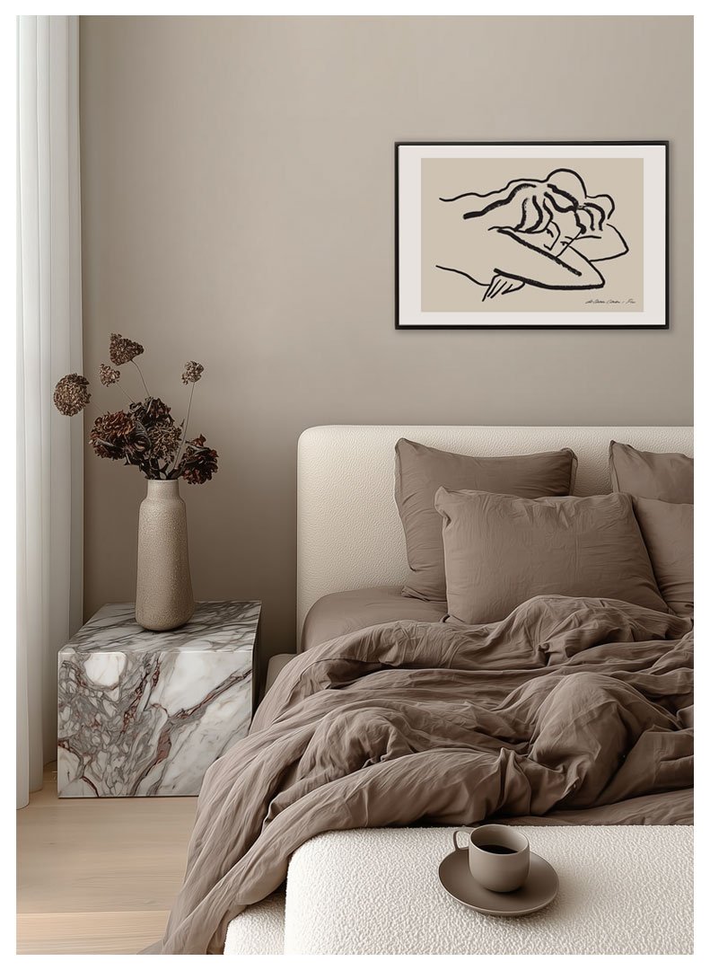 Gulinčios moters grafinis plakatas. Minimalistinė meniškų eskizinių linijų iliustracija suteiks interjerui jaukumo ir estetiškumo.