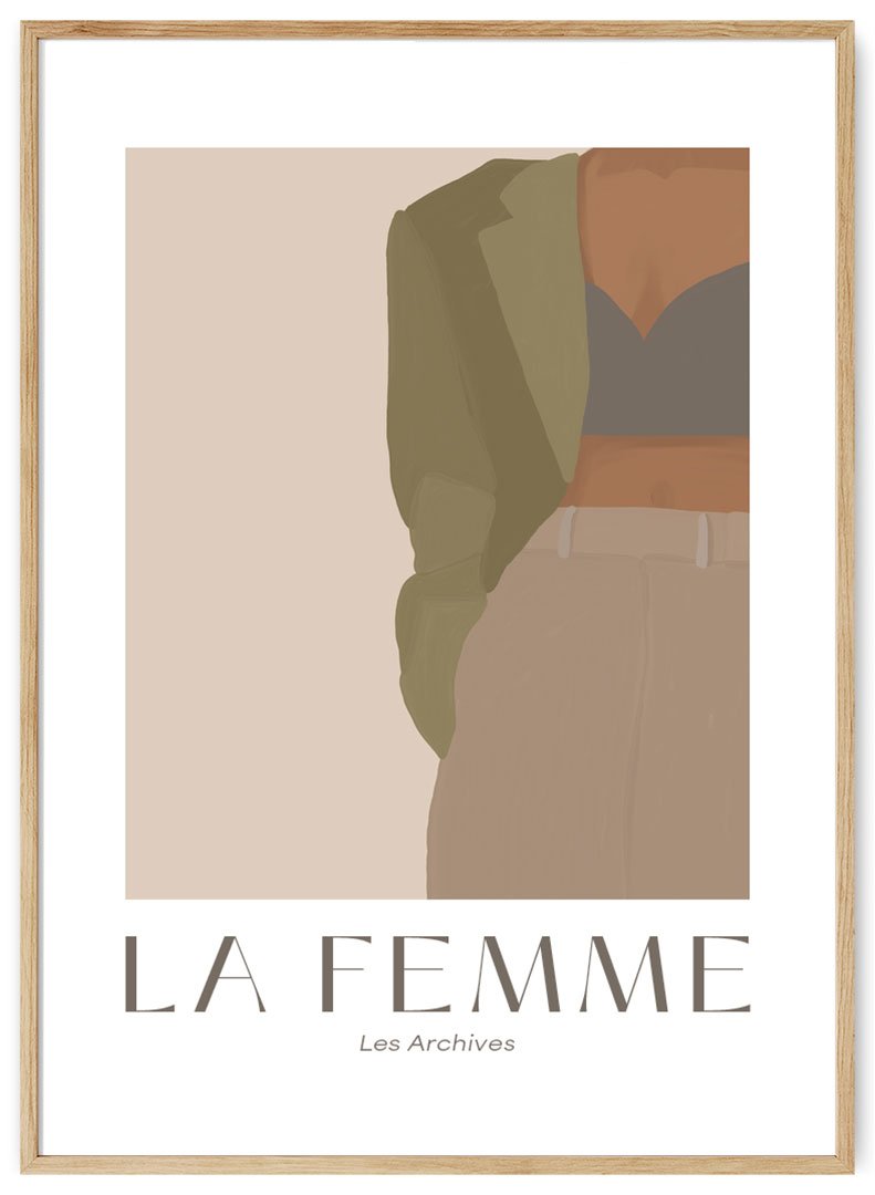 Merginos su samaniniu švarku plakatas. Stilingas šiuolaikinės moters plakatas papildys interjerą rafinuotumu ir suteiks erdvei stilingumo.