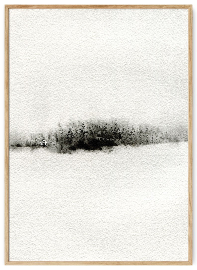Ranka pieštas ant faktūrinio akvarelinio popieriaus miško peizažo plakatas. Minimalistinis juodai baltas subtilus užsnigtų laukų ir miškų peizažas subtiliai papuoš interjerą.