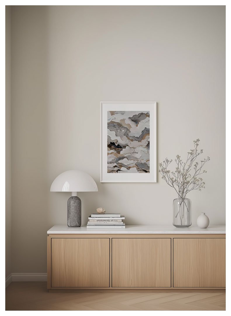 Abstraktus tapytas plakatas perteikia banguojančių potėpių ritmą ir natūraliai persipinusias spalvas. Baltos, smėlinės ir pilkos tonai kuria švelnią harmoniją, kurią subtiliai sustiprina juodos spalvos akcentai. Tai ramybės ir judesio derinys, puikiai tinkantis minimalistiniam, moderniam ar Japandi stiliaus interjerui. Organiškos kompozicijos plakatas įneš jaukumo ir estetinės pusiausvyros į bet kurią erdvę.