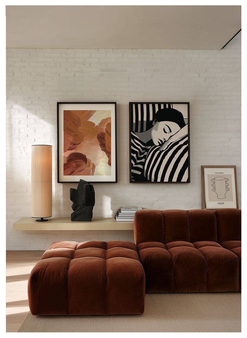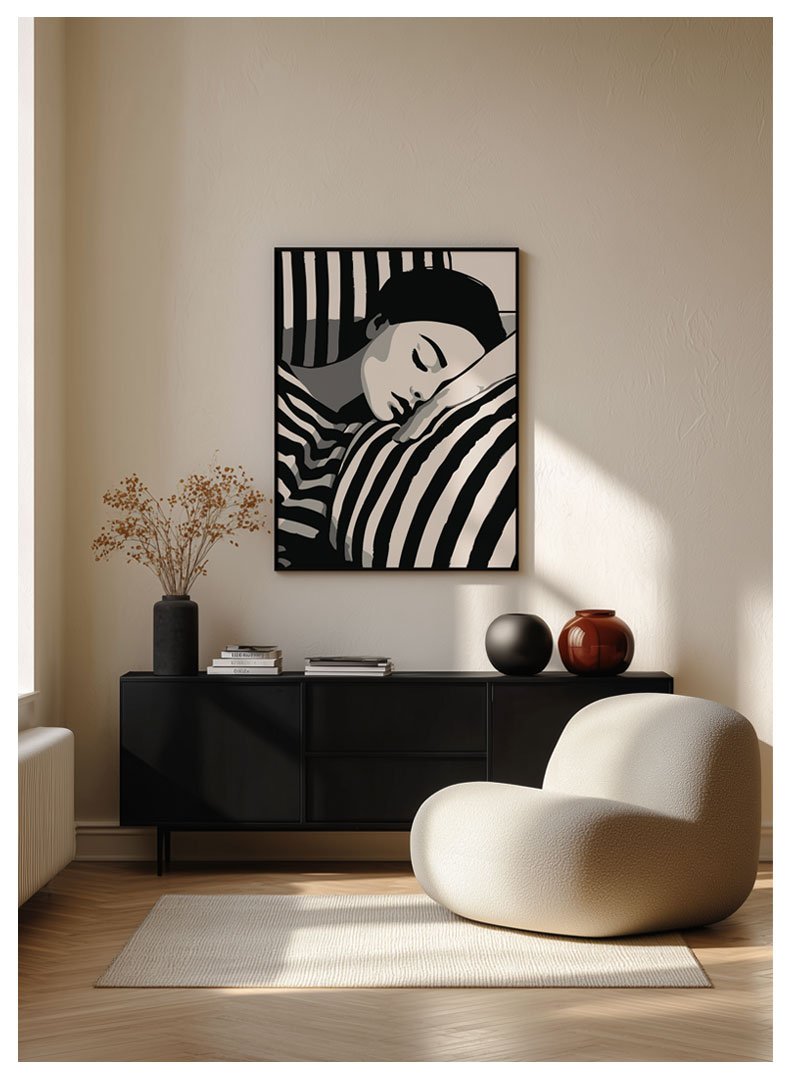 Grafinis plakatas vaizduoja užsnūdusią merginą ant sofos, kur rami veido išraiška susilieja su kontrastingomis juodai baltomis linijomis ir kuria išskirtinį vizualinį ritmą. Drąsus, grafiškas stilius suteikia kūriniui charakterio ir paverčia jį ryškiu interjero akcentu. Tai stilingas plakatas, puikiai tinkantis tiek jaunimo kambariams, tiek modernioms svetainėms, kuriose norisi išraiškingo, dėmesį traukiančio meno kūrinio.